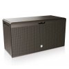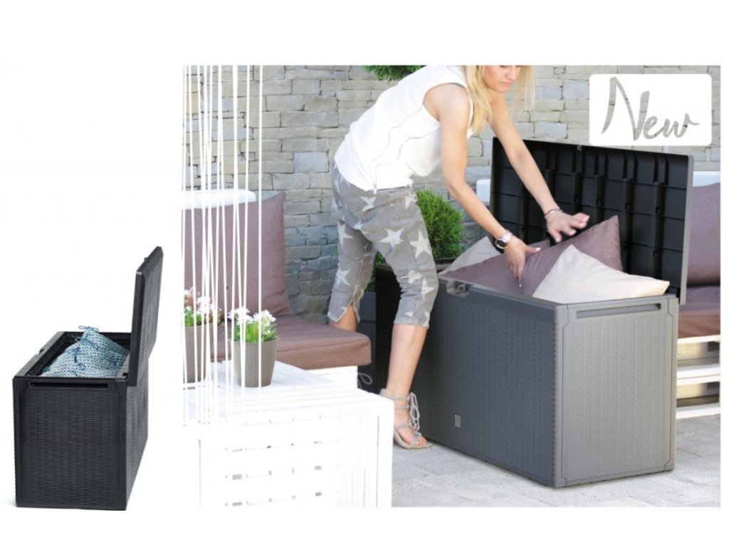 Plastový úložný zahradní box RATO s imitací pleteného ratanu. Zahradní box vhodný pro uskladnění zahradních polstrů, zahradního nářadí, dětských hraček apod. Součástí boxu RATO jsou kolečka a úchyty pro snadné přesouvání.