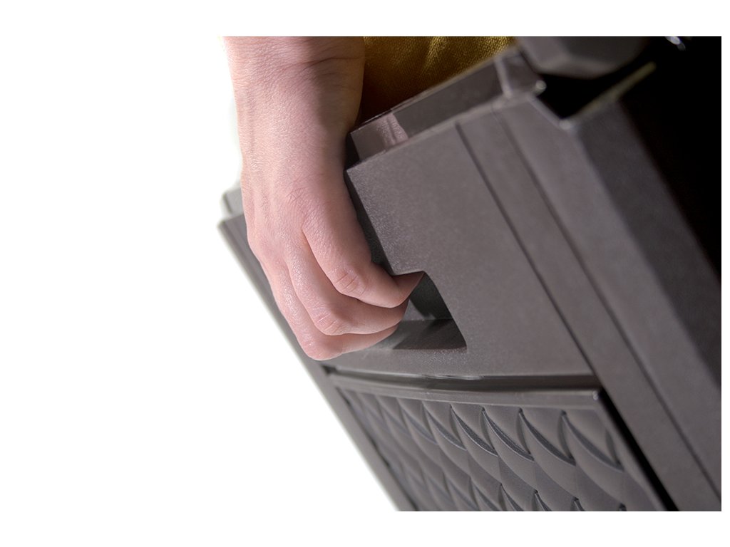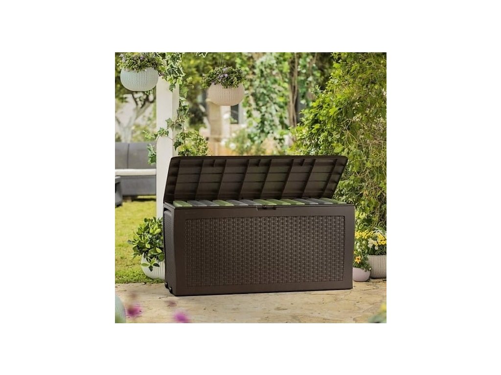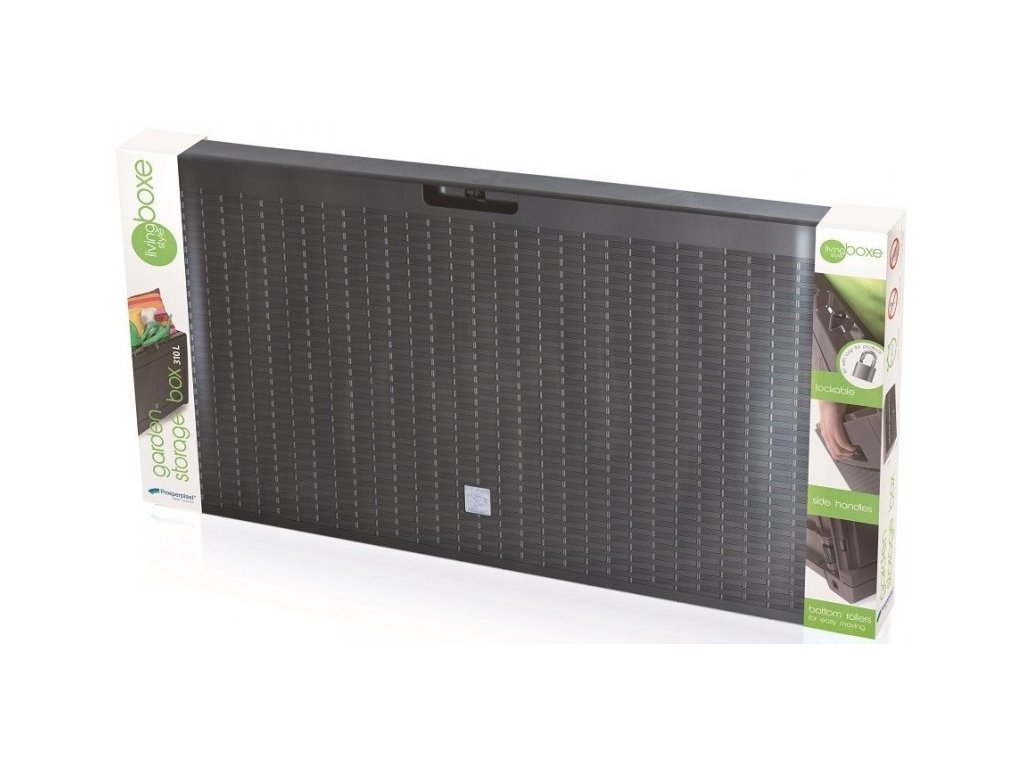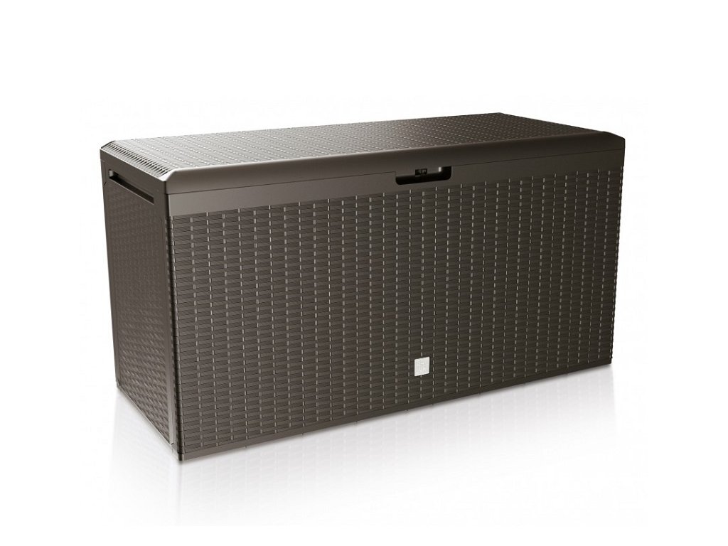 Plastový úložný zahradní box RATO s imitací pleteného ratanu. Zahradní box vhodný pro uskladnění zahradních polstrů, zahradního nářadí, dětských hraček apod. Součástí boxu RATO jsou kolečka a úchyty pro snadné přesouvání.